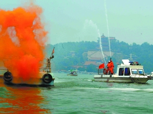 本報(bào)訊(記者任敏)一艘游船上冒出橘黃色的煙霧,1分鐘后快艇轉(zhuǎn)運(yùn)游客,2分鐘后消防艇上的2條水柱澆滅“大火”。這是昨天發(fā)生在頤和園的“3分鐘滅火”的精彩瞬間。