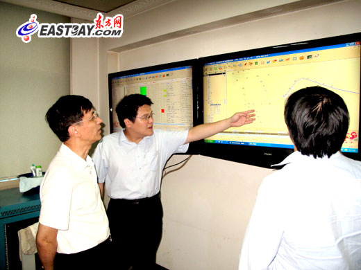 圖片說明:工作人員在向東方網(wǎng)記者介紹長途汽車實(shí)時(shí)GPS定位信息