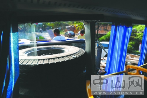 公交車受兩臺車夾擊后,車窗玻璃被撞得粉碎,一只輪胎從車窗飛了進(jìn)來。