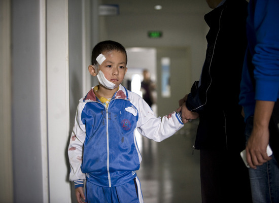 10時(shí)許,記者趕到深圳第三人民醫(yī)院急診外科,很多學(xué)生正在排隊(duì)等候。6歲半的鄭榮祺傷得比較嚴(yán)重,校服上有多處血跡,眼角和臉部都被劃傷,縫了幾針,眼角帶著淚水,眼神中還有點(diǎn)恐慌。5歲小女孩萬湘?zhèn)米钪亍倓傋鐾隀z查后,她閉眼躺在活動(dòng)車上,不愿跟別人說話。