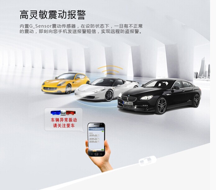 10、車輛在受到震動的情況下,如、拖車、砸玻璃、碰撞、偷輪胎設(shè)備就會通過手機第一時間通知到車主。