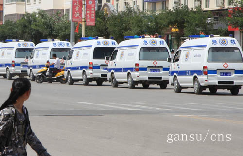甘肅省慶陽市緊急醫(yī)療救援環(huán)縣分中心17輛安上了GPS定位系統(tǒng)的救護車上街宣傳。張永鑫 攝