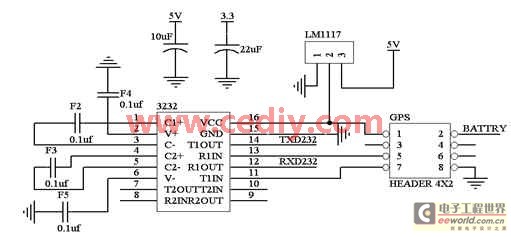 由于51系列單片機(jī)的電平為TTL電平,而GPS模塊為3.3V供電,所以選用LM1117作為GPS模塊的電源,通信部分選用了MAX3232把3.3V的邏輯電平轉(zhuǎn)換成232電平。