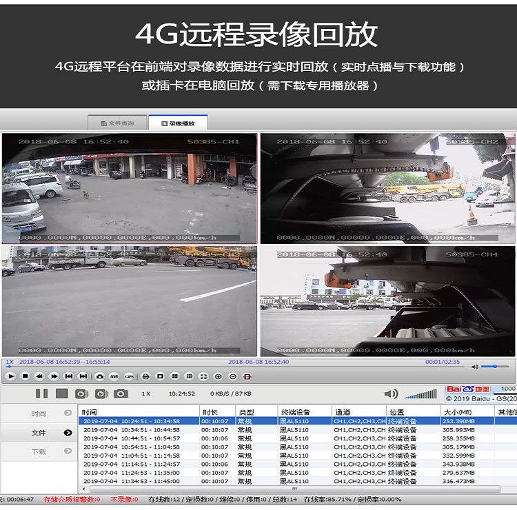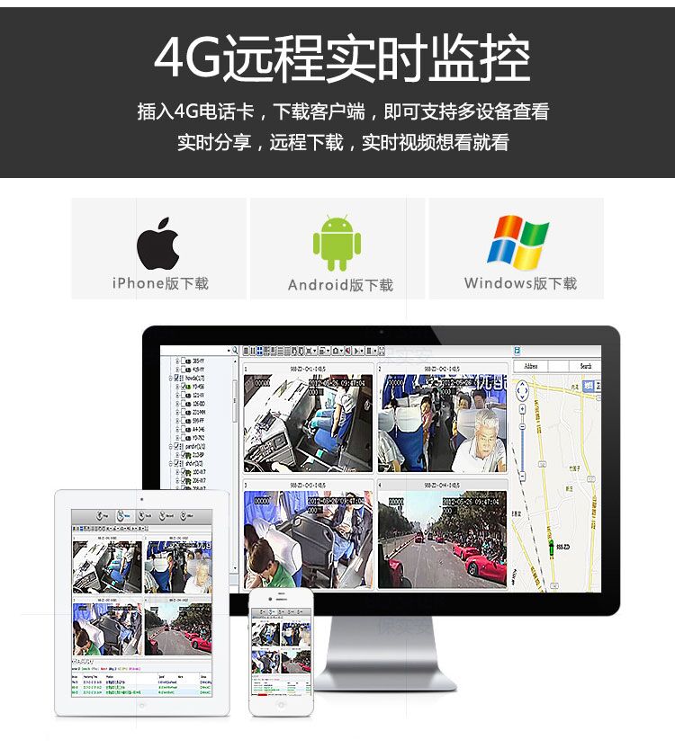 高清4路車載視頻,電腦實時監(jiān)控,安卓,蘋果手機遠程隨時隨地掌握車輛安全情況;