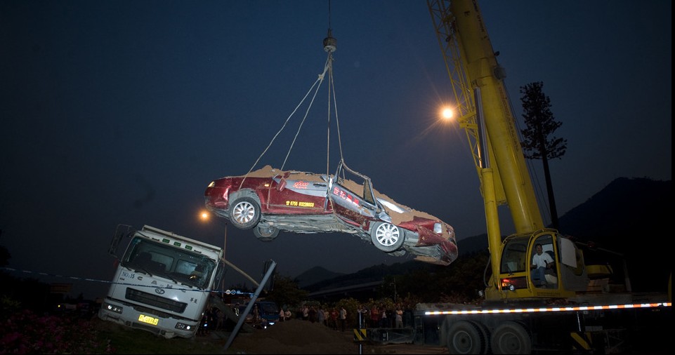 出租車被壓扁,工作人員把小車吊到空曠的地方進一步調(diào)查 南都記者 陳文才 攝