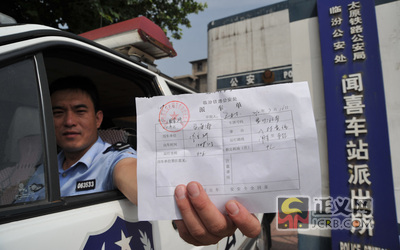 圖1、7月16日,山西臨汾鐵路公安處聞喜火車站派出所警車司機在展示警車出車派車單?!?/P>