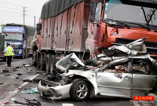 據(jù)周邊居民稱,昨日上午聽到一連串相撞的聲音,跑到路上查看才知道出了大車禍。車禍現(xiàn)場可謂慘烈:紅綠燈前不到100米的路段,11輛車接連相撞,其中包括5輛小貨車、4輛大貨車和2輛小轎車,其中最嚴(yán)重的一輛小轎車被完全壓扁。