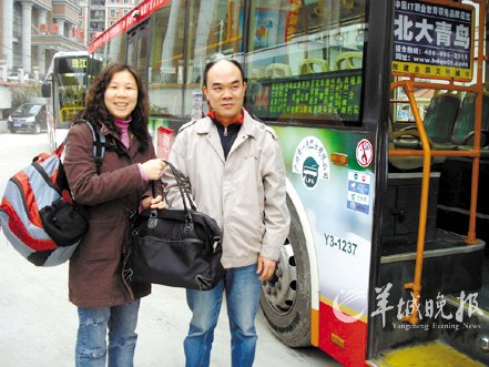 找回手提袋的黎女士與公交車司機合影