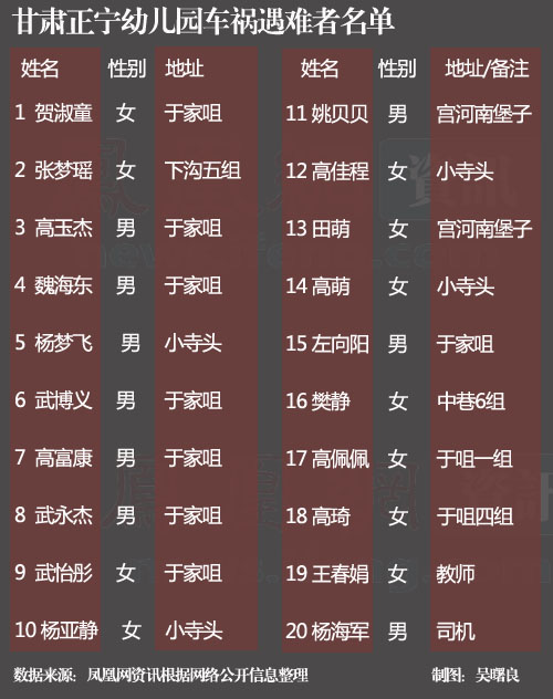 記者從甘肅省政府應(yīng)急辦獲悉,該校車共載64人,其中司機、幼兒園教師各1人,幼兒62人。事故已造成20人死亡,其中1名校車司機和4名幼兒當場死亡,14名幼兒和1名教師受重傷經(jīng)醫(yī)院搶救無效死亡,其余44名受傷幼兒中,重傷12人,輕傷32人。受傷幼兒正在慶陽市醫(yī)院和正寧縣醫(yī)院接受治療。