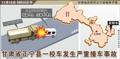 11月16日,甘肅慶陽市正寧縣榆林子鎮(zhèn)發(fā)生重大交通事故,一輛運煤貨車與幼兒園校車迎面相撞。事故造成20人死亡,44名幼兒受傷。經(jīng)初步調(diào)查,該校車相關(guān)手續(xù)合法,核載9人,實載64人,屬嚴重超載。